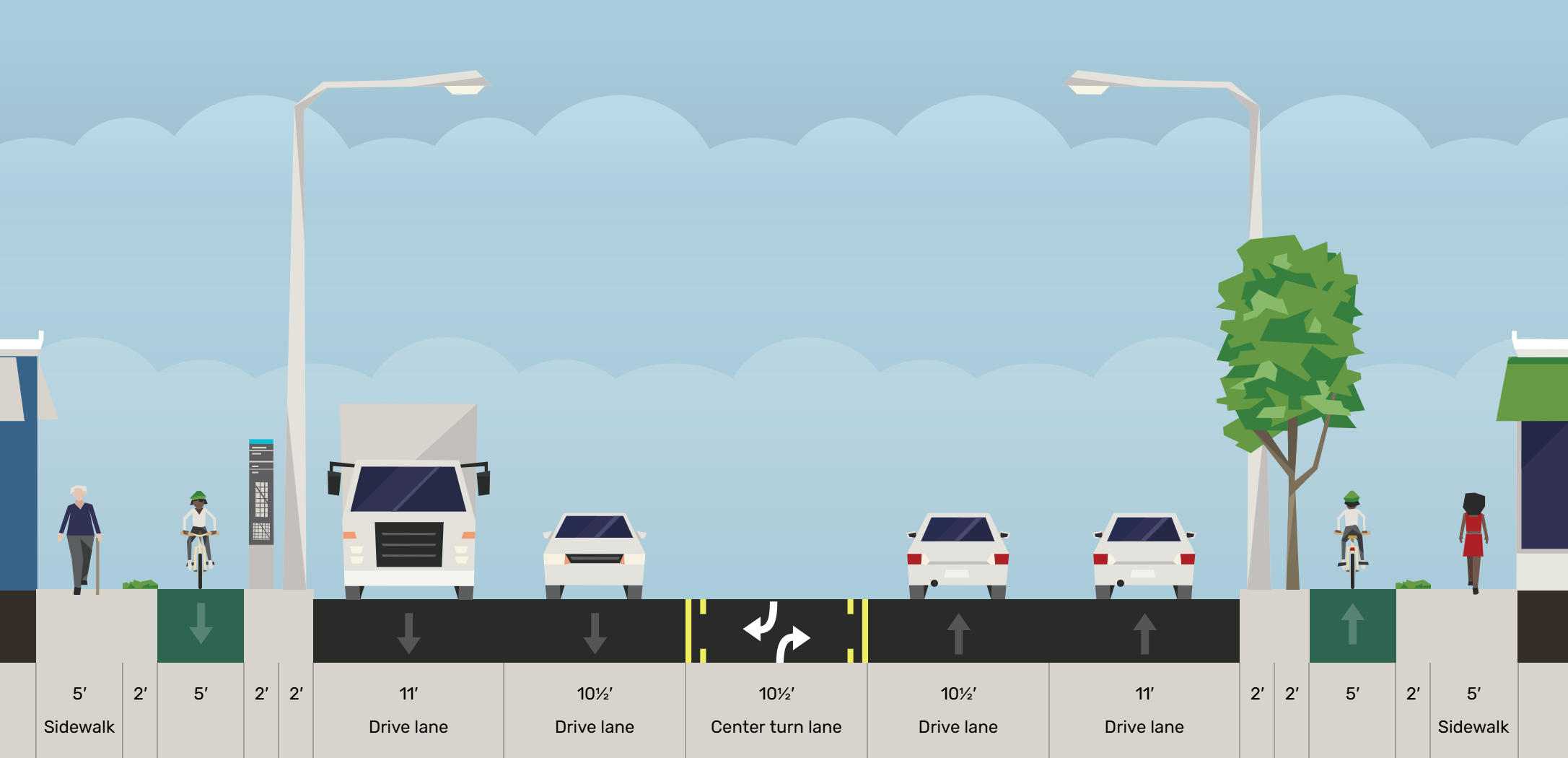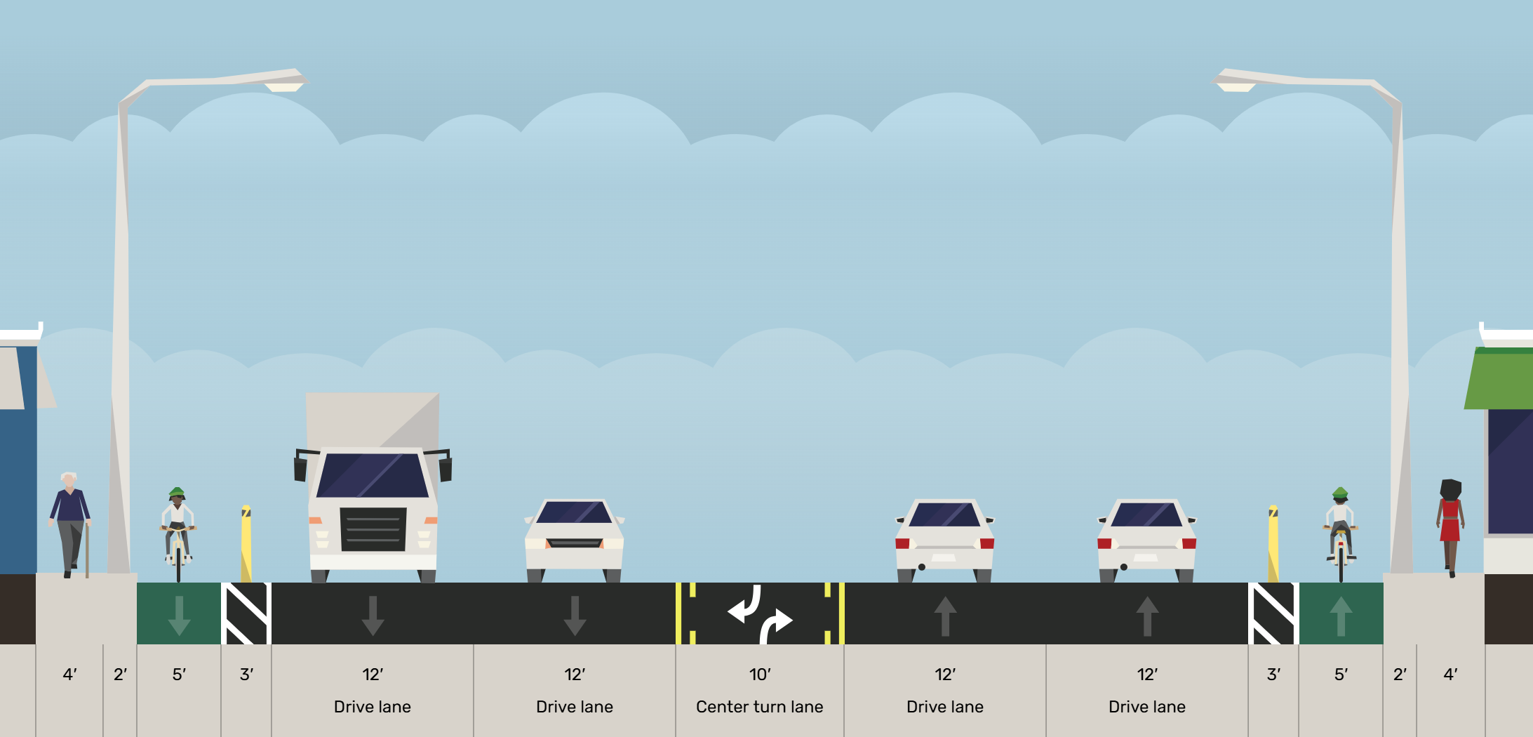 A street level bike lane separated from traffic by a three-foot-wide median, including painted lines as well as bollards or other dividers, renderings show. The bike lanes would take the place of the two outer lanes, leaving two driving lanes in each direction as well as a middle lane for turning at intersections.
