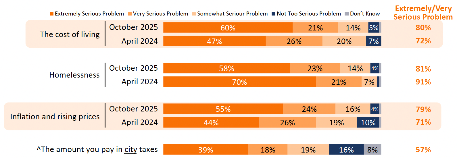 Respondents to the poll agreed that the economy is an issue, with 80% feeling that cost of living is a serious problem, up from 72% in April 2024. Similarly, 79% said inflation is a serious concern, up from 71%.