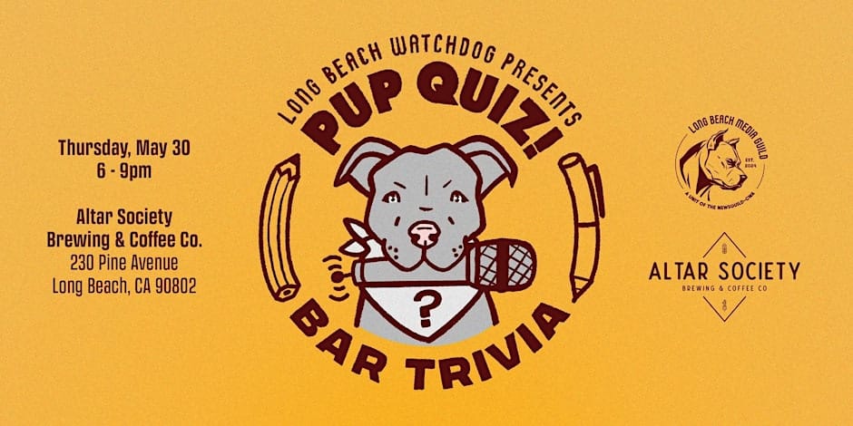 P.S., I would like to formally invite you to the Long Beach Watchdog’s Pup Quiz Bar Trivia at Altar Society Brewing & Coffee Co. in Downtown this Thursday. Just smash this link here to register. It’s $10 per person to pre-register or $15 at the door. Some pretty great prizes will go to the 1st, 2nd and 3rd place teams — but best of all, you’ll be quizzed by the staff and reporters of the Watchdog themselves. You’d better dust off that noodle of yours.