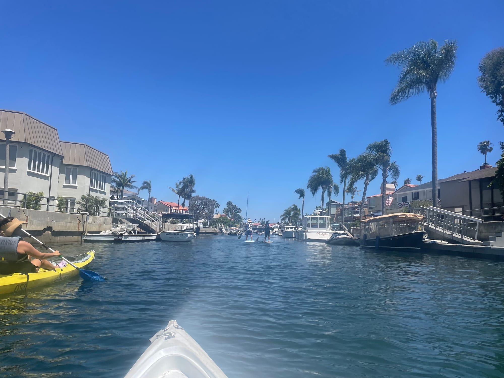 Somehow, in my seven years of living in Long Beach, I'd never gone kayaking. I realize now that was a big mistake β huge. If this is you too, check it out: It's $14 per hour, per person to rent yourself a little vessel. You can pick a single kayak or a double kayak. If it's your first time, you might want to grab a friend and pick the two-seater (double) so that you can work together to paddle, but a single is more than manageable in Alamitos Bay's waveless waters.