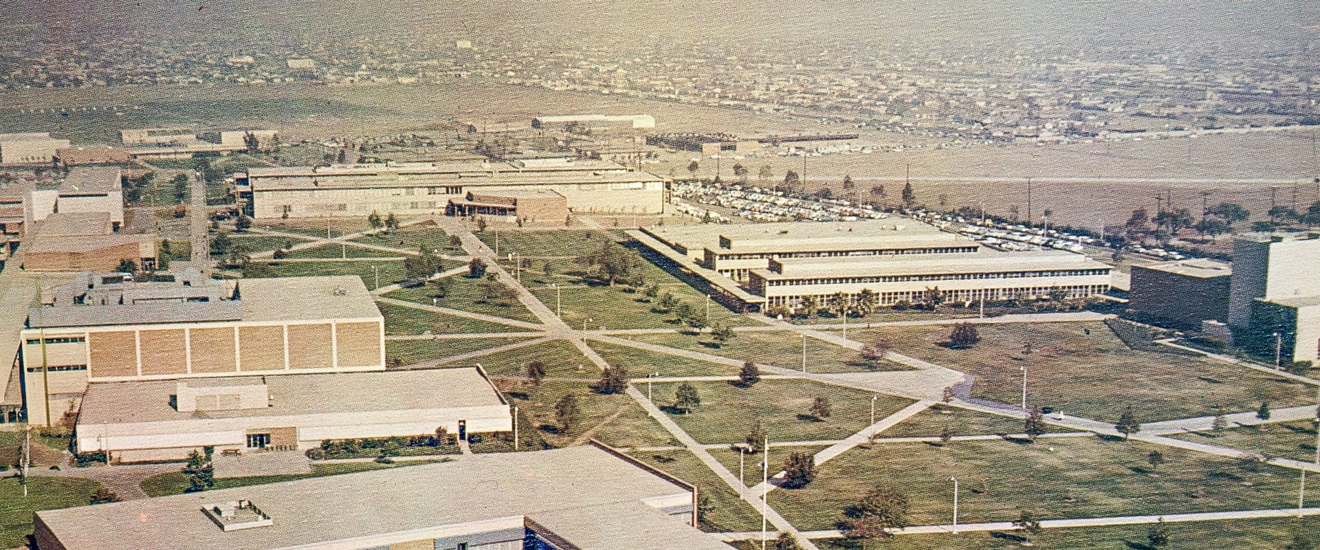 Construction of the pedestrian-friendly campus, initially drawn up by Ed Killingsworth and his firm, began in the summer of 1951. By 1958, the first dormitories were completed, making the campus a residential rather than a commuter college.