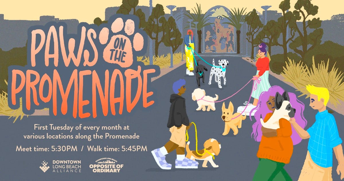 Paws on the Promenade takes place Tuesday, April 7 and every first Tuesday of the month thereafter at the Long Beach Promenade. Meetup time is 6 p.m.; walk time is 6:30 p.m.