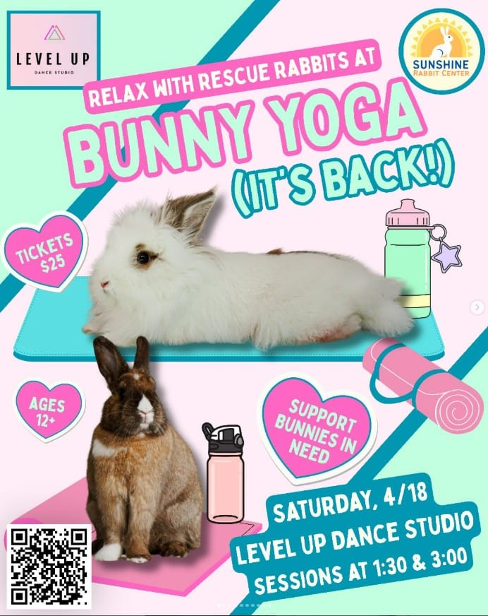 Join in on a sylvan stretch session hosted by the Sunshine Rabbit Center bunnies at Level Up Dance Studio! Enjoy a session of gentle yoga while rescue rabbits gambol around you and ask for pets while you enjoy your calming afternoon session. Yogis from 12 years old and up are welcome! Bring your water bottle, mat and your phone to snap lots of pictures!