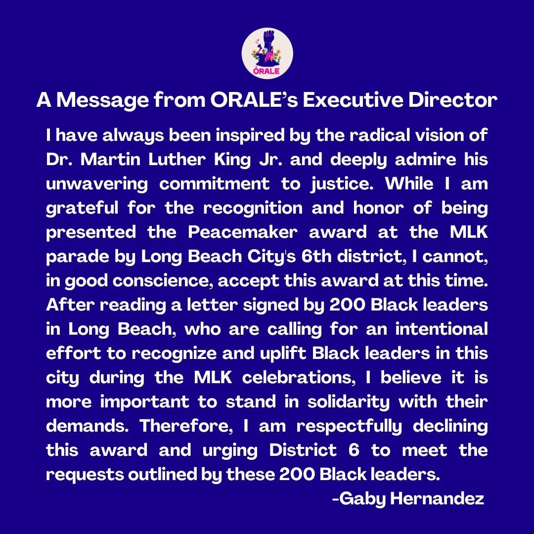 Citing the need to uplift Black leaders, Órale executive director Gaby Hernandez said Thursday she would not accept a Martin Luther King Jr. Peacemaker award, a move that Long Beach Black community activists say will intensify their push for better representation at the annual Martin Luther King Jr. Parade.