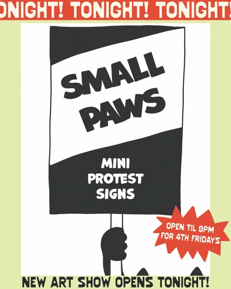 Local professional sign painters, artists and illustrators have created miniature protest signs that the proprietors say that their cat “would totally hold if they had opposable thumbs.” The show concept, curation and supporting materials are by Katie Vonderheide, who also painted the little shop’s mural and created the window art.