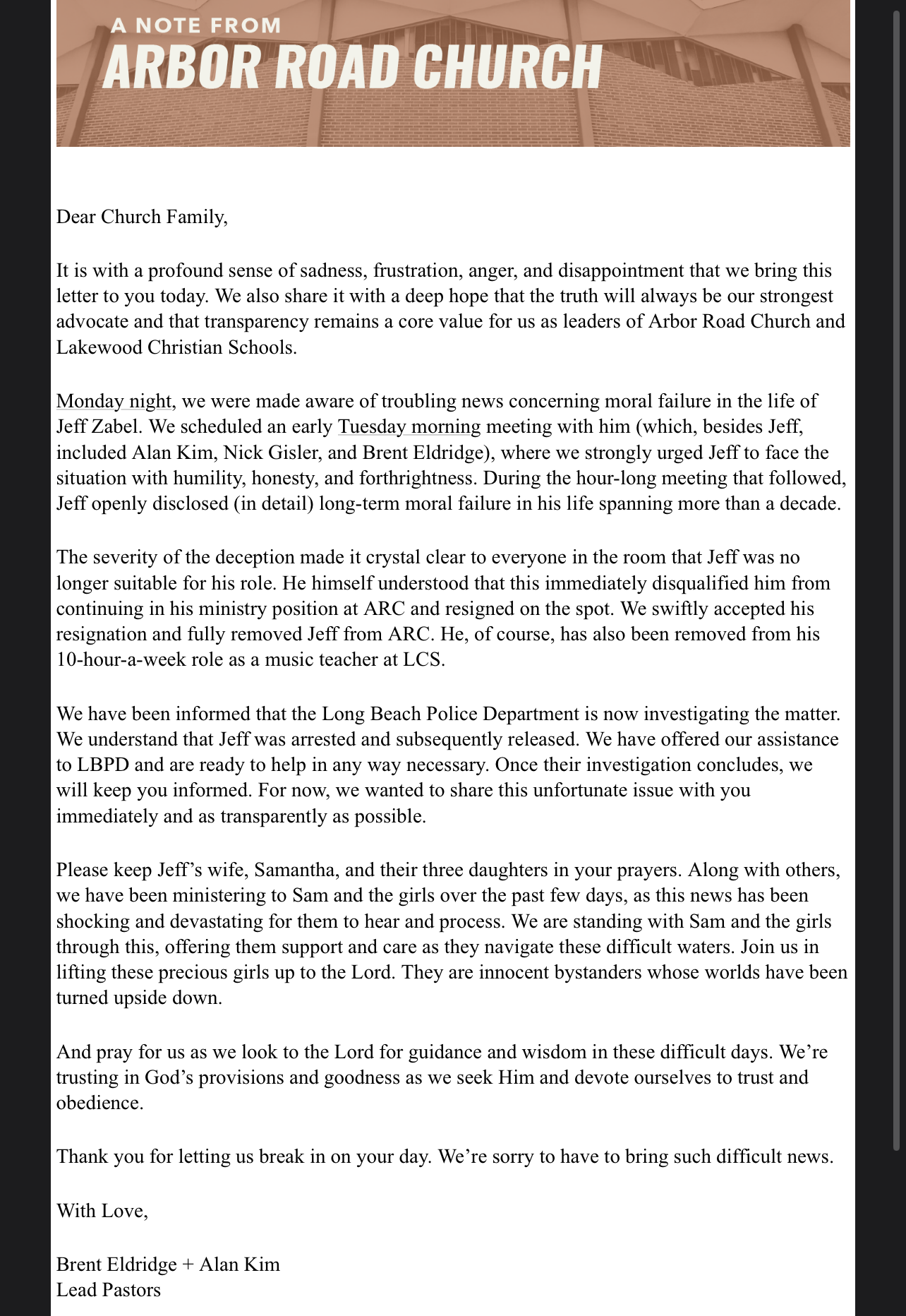 “We have offered our assistance to LBPD and are ready to help in any way necessary,” the pastors said in their email. “Please keep Jeff's wife, Samantha, and their three daughters in your prayers.”