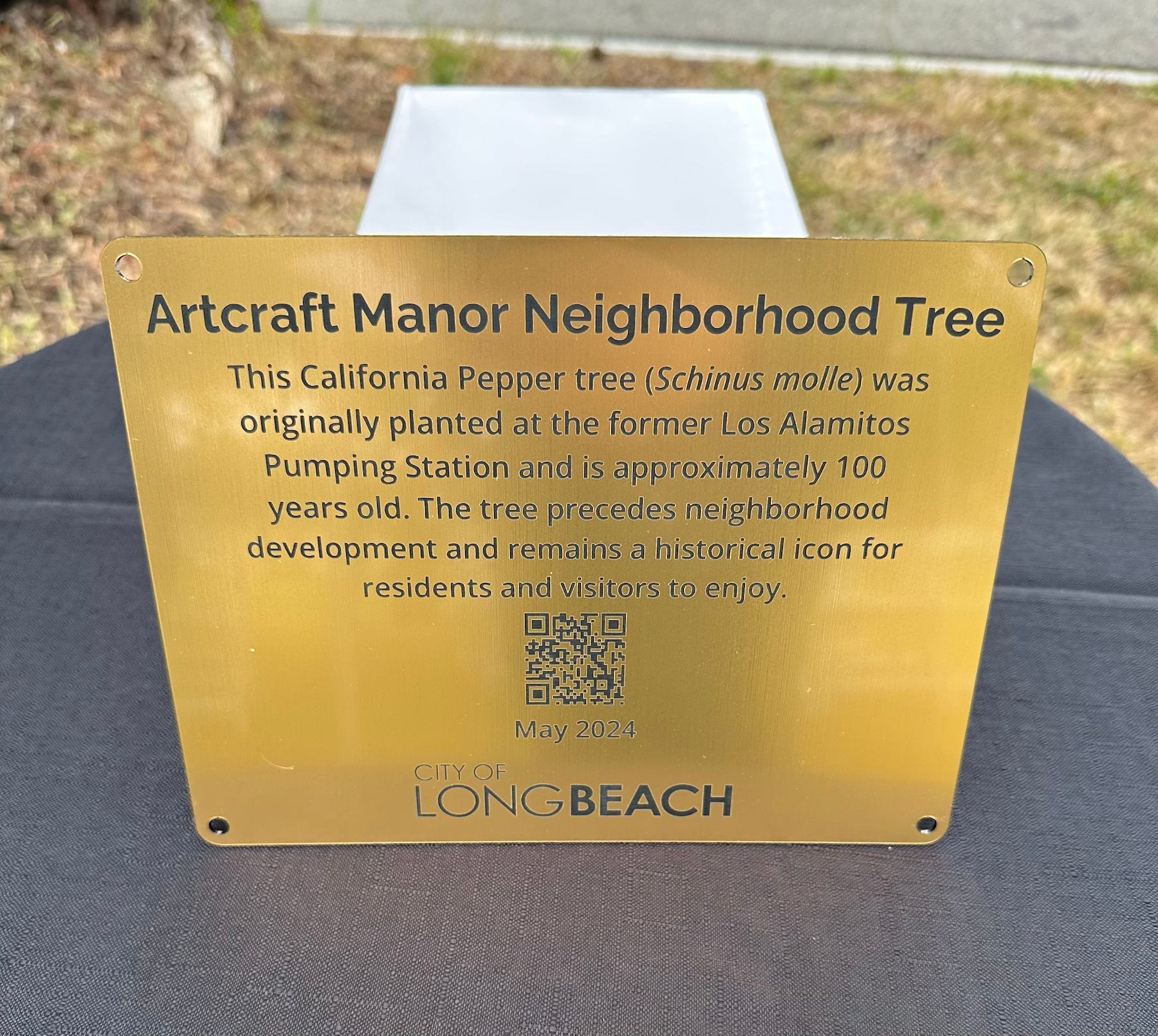 The tree’s plaque has a QR code that can be scanned to learn more about its history as well as the community that was around when it was first planted.