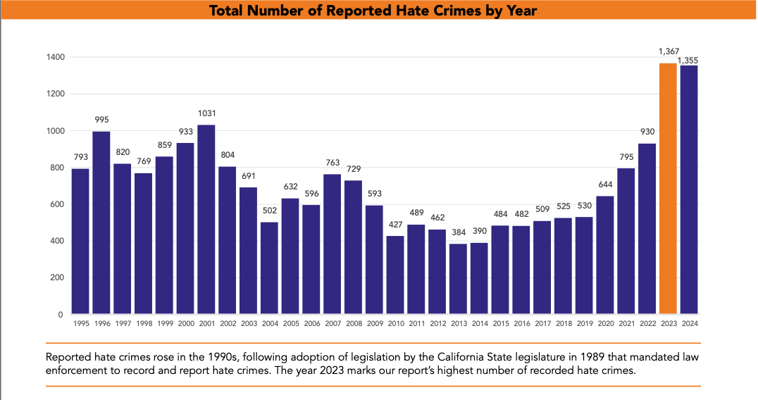 That incident is one of the 1,355 hate crimes counted in the new 2024 Los Angeles County Hate Crime report, released earlier this month. Titled “Strength in Numbers,” the report states that 2024 was the second worst year for hate crimes in the 44 years that the LA County Commission on Human Relations has been tracking them, though not by much.