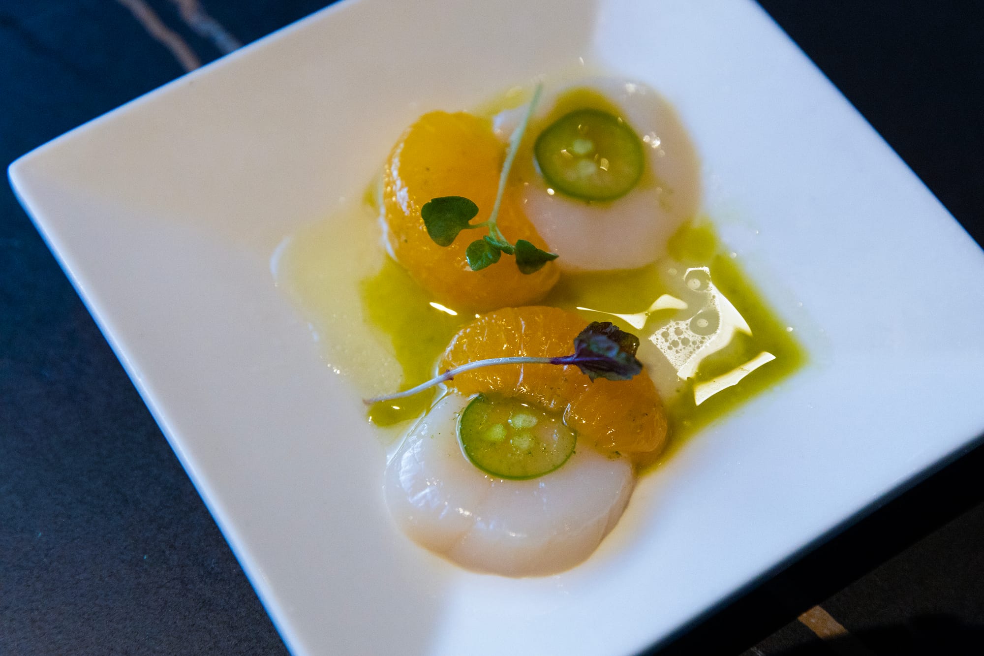 Left: Hokkaido scallop carpaccio with mandarins, jalapeño, cilantro oil and white soy. Right: Bluefin tuna sashimi. Photos by Brandon Richardson.