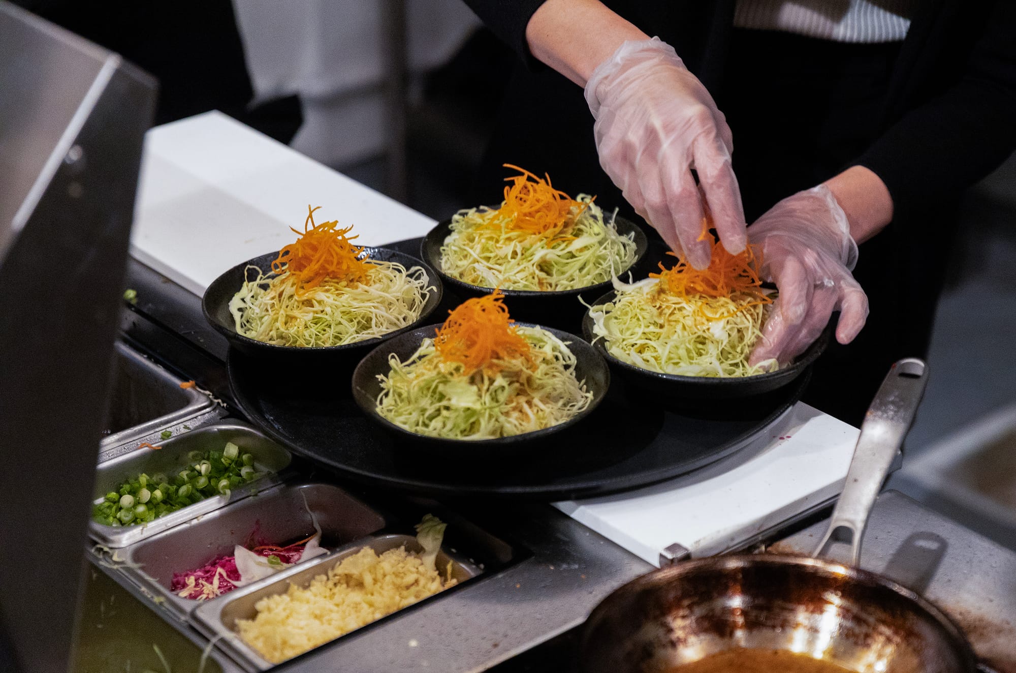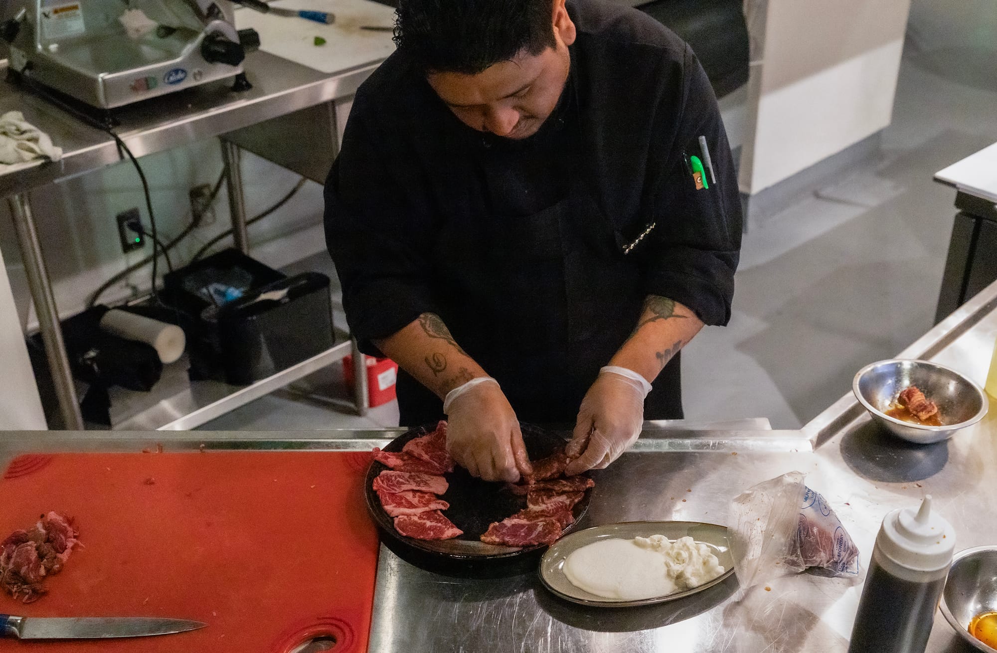 Left: Staff preps cabbage salads at Sosogu Sushi and Japanese BBQ, the newest restaurant at Long Beach Exchange, Tuesday, March 11, 2025. Right: A5 Japanese wagyu rib cap with yuzu salt. Photo by Brandon Richardson.