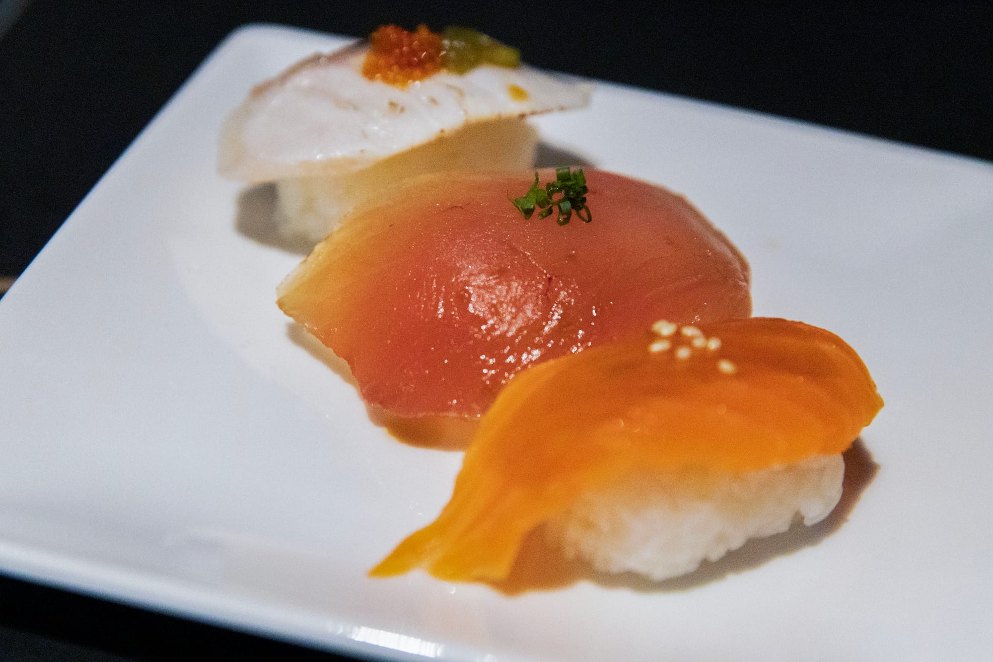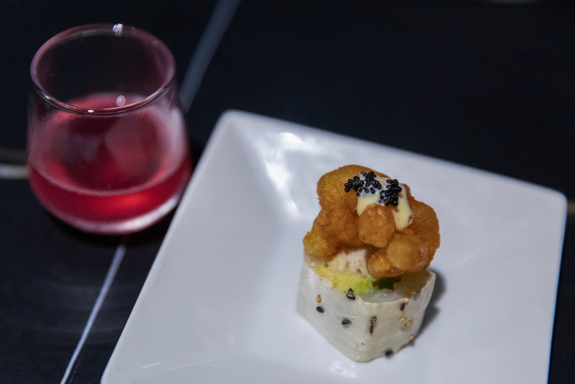 Left, from front: albacore, ora king salmon, seabream nigiri. Right: Tempura lobster roll with avocado, blue crab, yuzu aioli and tobiko, served with a Dragonfruit Highball made with Kikori whisky, ginger and dragon fruit jelly. Photo by Brandon Richardson.