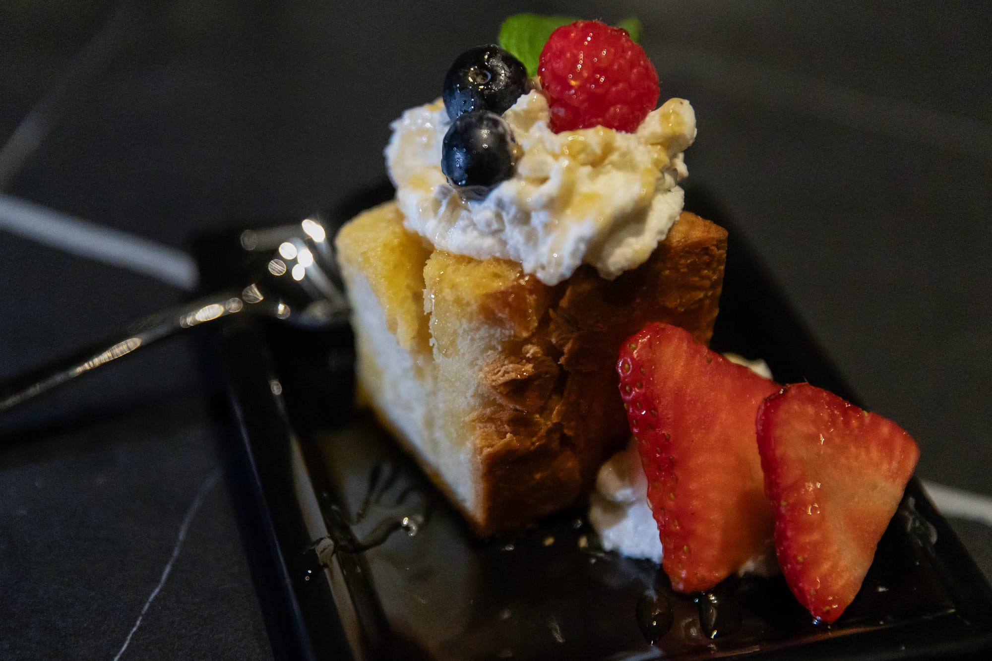 Left: Sosogu lead cook Israel Ortez, 34, plates meat at the new Long Beach Exchange restaurant Wednesday, March 11, 2025. Right: Toasted sweet bread with salted honey whipped cream and berries. Photos by Brandon Richardson.