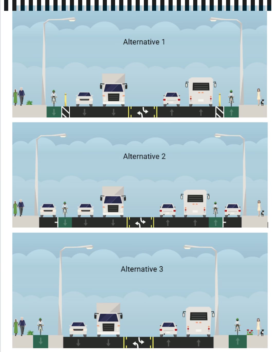 All the options presented to cyclist advocates and residents last week would eliminate a lane of vehicle travel in each direction. Still, the types of bike lanes that could be installed vary greatly in price and how comfortable cyclists say they’d feel using them.