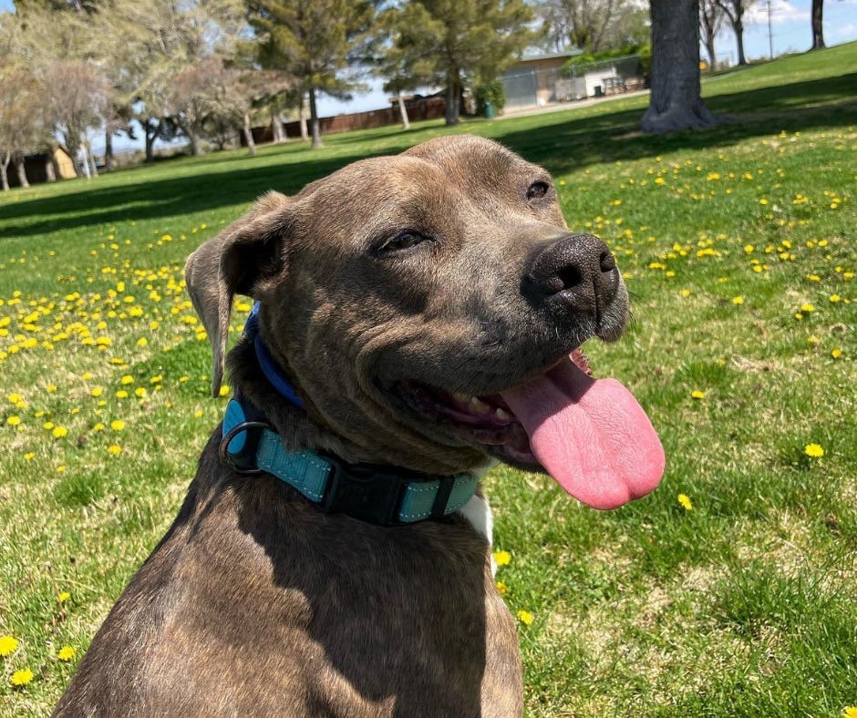 Levi is a good boy who loves people and all that goes into being part of the family. He enjoys getting out and about to smell all the smells and meet all the people. He’s affectionate, cuddly, and finds a way to snuggle close and lay his giant dome on your lap. Just make sure that when you see Levi approach, you hit the bathroom and have absolutely nothing left to do in your day because, as you’ll tell yourself, only a monster would get up from under his big, doting eyes. Levi is five or six years old and is rebuilding his stamina after being found as an emaciated stray with an abdominal blockage, but he’s now showing all kinds of pep in his step on walks and mini-excursions!