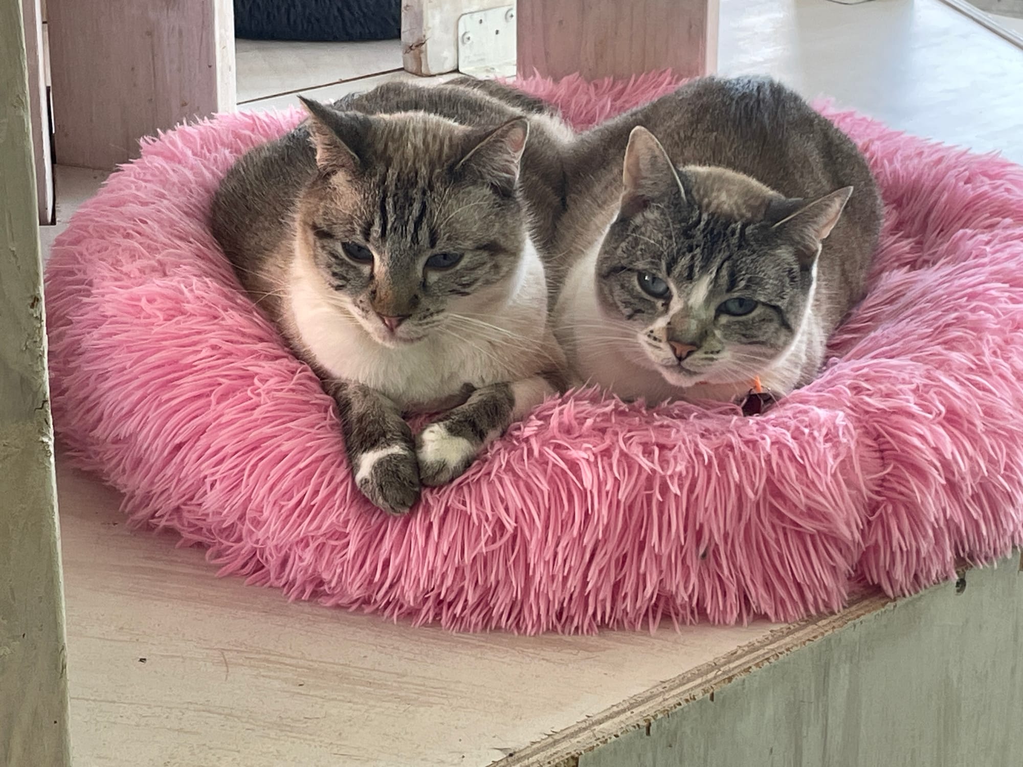 Aren’t they sweet? It’s been a bit of a journey for Lexi, 2 years old, and her son, Brody, also almost 2. Yes, Lexi was just a few months old, living in the bushes, when she delivered Brody. Even after they were rescued, it was obvious how much Lexi loved and doted on her little son, and so, they’ll need to find a forever home where they can stay together. Lexi is sweet, with a tiny meow. She loves petting, but can be timid at times. Brody has also been cautious, but he’s opening up to people more and more. You’ll often find the two of them playing together or nesting in the tunnels for a nap.