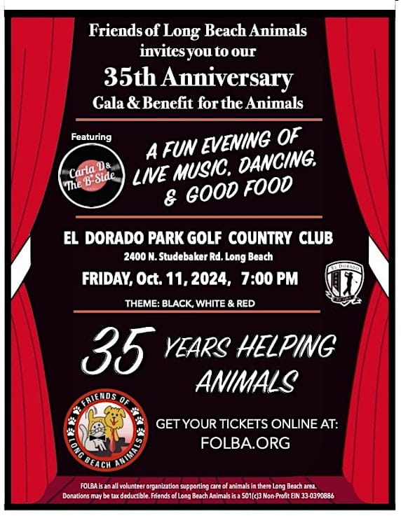 Friends of Long Beach Animals is celebrating its 35th year on Friday, Oct. 11as the city’s most venerable animal-advocacy organization. FOLBA has been helping people with their pets and the pets themselves since a lot of you were puppies and kittens or maybe weren’t even part of a litter yet. Celebrate an anniversary with this wonderful bunch of people — dance to live music, dine and drink, and meet special guest TV actor Tom Kiesche (“Breaking Bad,” “Third Rock from the Sun”) and a bunch of four-legged attendees. Date, time, location and other details are on graphic. Buy your tickets here!