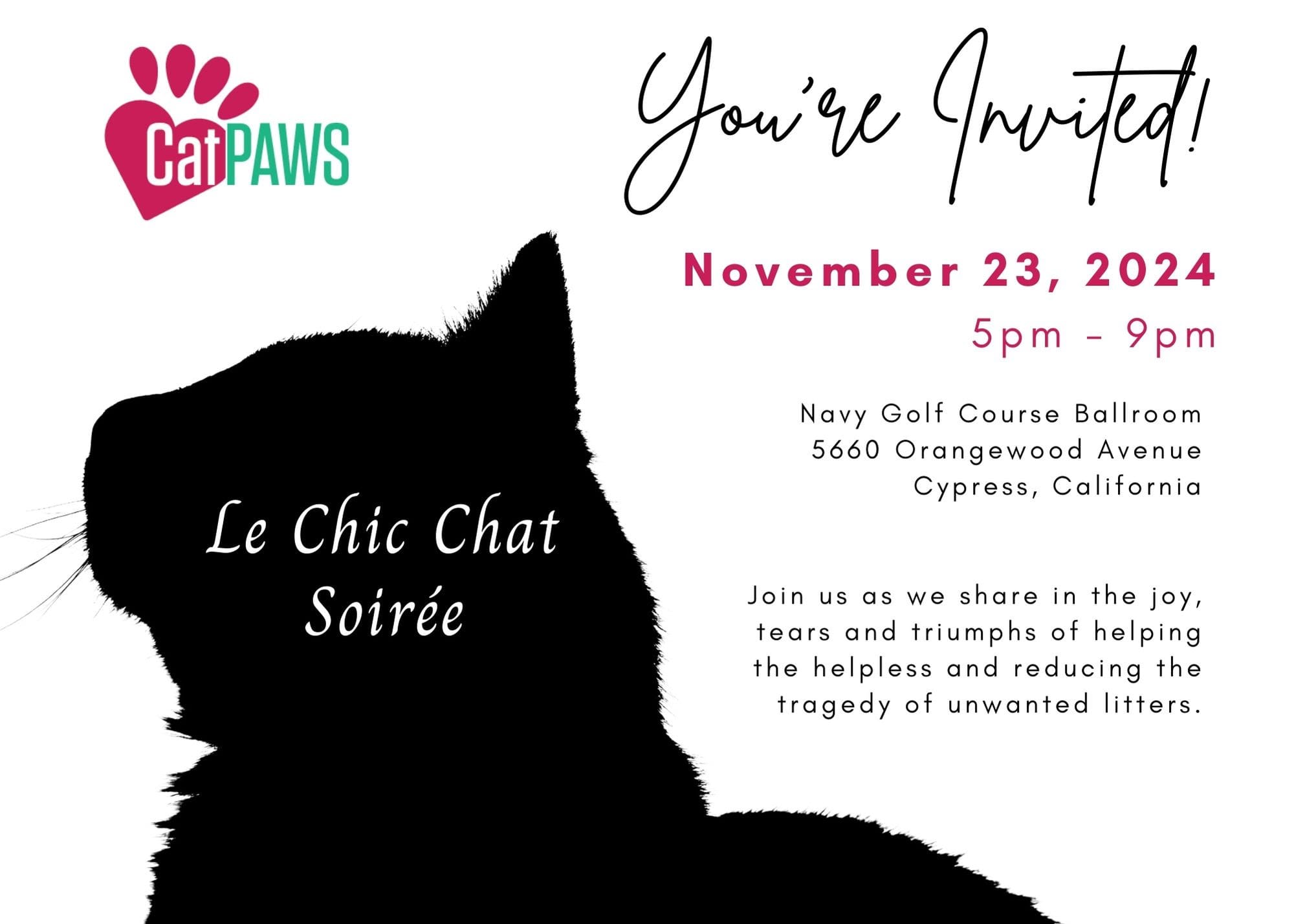 On Nov. 23, Helen Sanders CatPAWS will present a fête that will lead in beautifully to the festive winter-season holidays. Le Chic Chat Soirée will begin with hosted cocktails and continue with auction items, trapping demonstrations, a chops-licking buffet dinner and — special guest Hannah Shaw, the Kitten Lady! Meee-yow! Plus, you’ll meet some of the lucky little recipients of CatPAWS’ spay/neuter efforts, medical attention and plain old love! Date, time, location and other details are on graphic; get tickets at this link.