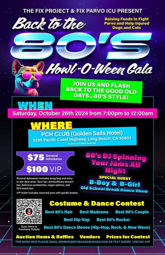 No one throws a party like the gang at Sparky and the Gang, and the one they’ll pitch on Oct. 26 promises to be a real howl! In fact, it’s called the Back to the 80s Howl-o-ween Gala! The party isn’t for dogs to attend — it’s for their lovin’ humans — but the funds raised through tickets will help the bowsers in Sparky fosters and in the parvo emergency clinic at Fix Long Beach. Dress up in your fave-rave 80s outfits, dance to the platters the DJ spins, and have a ball. Date, time, location and other details are on graphic; scan the graphic for tickets.