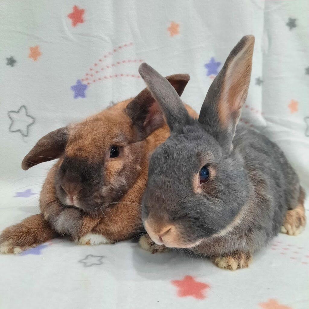 Pumpkin, the brown/orange male bunny, and his companion, adorable gray-lady Willow, are super in love and care for each other deeply. This senior pair had a loving home, but their owner passed away. They’re sweet and mellow and enjoy cuddling together and the companionship of people they trust. This precious couple is looking to find their forever retirement home. If you can’t resist such a lovely couple, you can fill out an adoption application online.