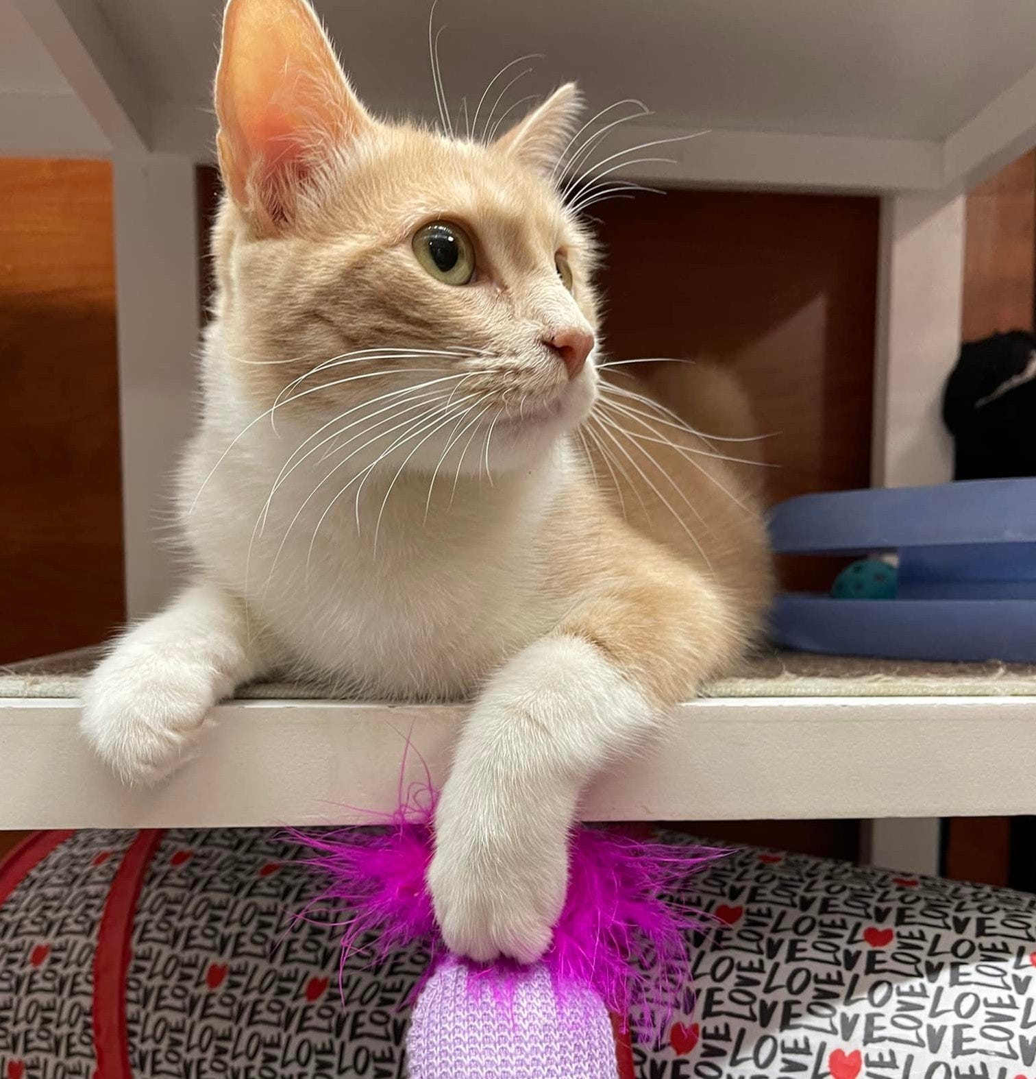 “Does no one want me?” Speaking of special, Mimosa is a beautiful, funny and smart orange girl, so full of personality that none of us can figure why she’s been with CatPAWS for over a year! Is it the kitten thing? They do grow up to be cats, you know, and there’s no one like Mimosa. She is beautiful, funny, smart and full of personality. Here’s what she likes: treats, toys, tightrope walking on top of the shower door, birdwatching on the other side of the window, helping with office work, and eventually curling up with her human. She needs a forever home.