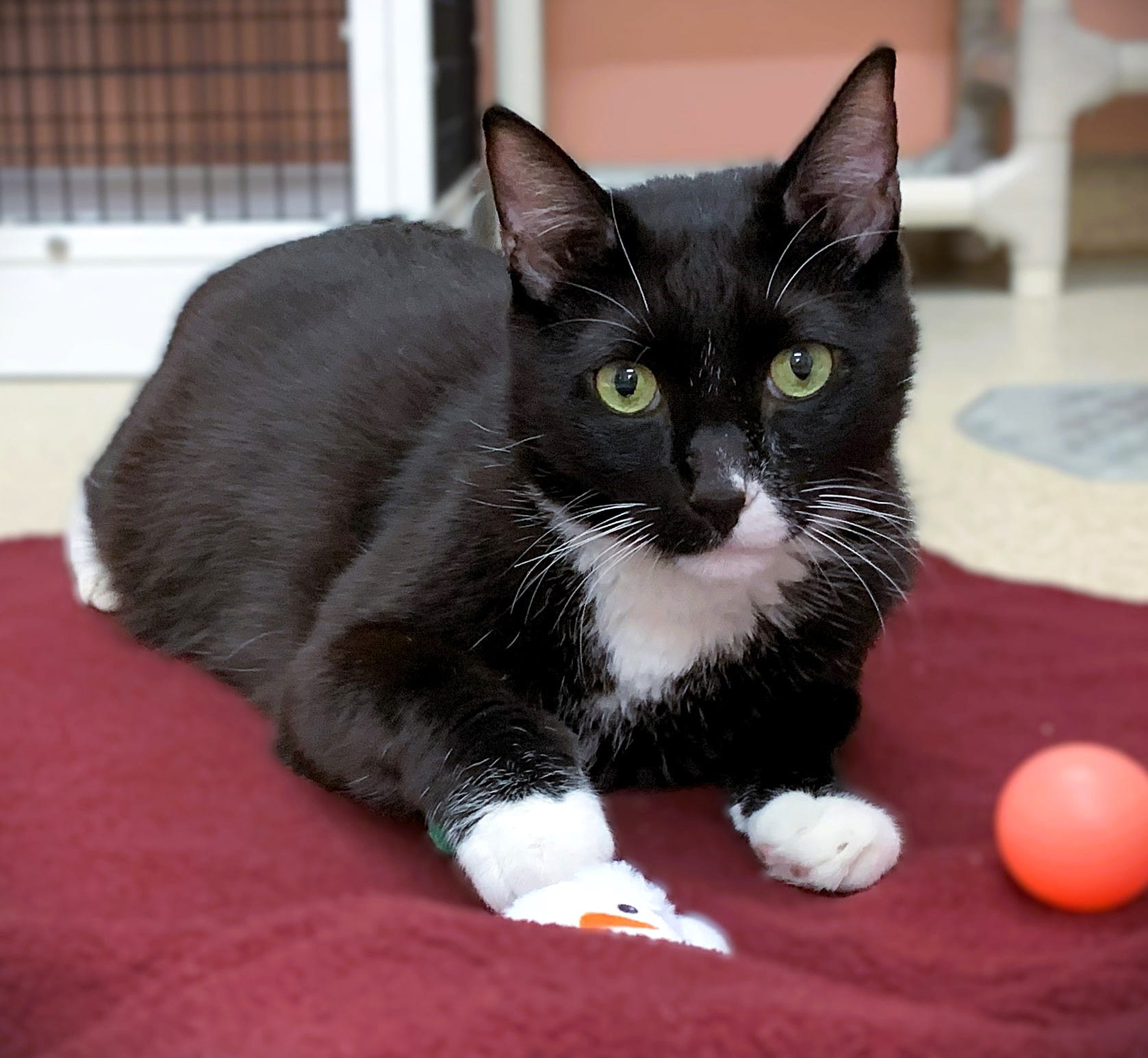 Howdy do to you — and guess what! That’s my name, Howdy Do! I originally came to SBACC as a kitten and was adopted when I was just 3 months old. I don’t know what happened, but a few years later, I found myself living on the street. I wound up in a humane trap set by someone trying to trap her own escaped cat — I walked in instead! She took me to a shelter to be scanned for a microchip, and found mine registered to SBACC! The original owners didn’t want me back (sigh). So back I came to SBACC, all the way from Altadena, dirty and hissy. But that was then, and now I’m a friendly boy hoping to find a forever home where I will be safe and loved. I have claimed this comfy bed as my own, but I will be happy to get up and greet you if you come for a visit!