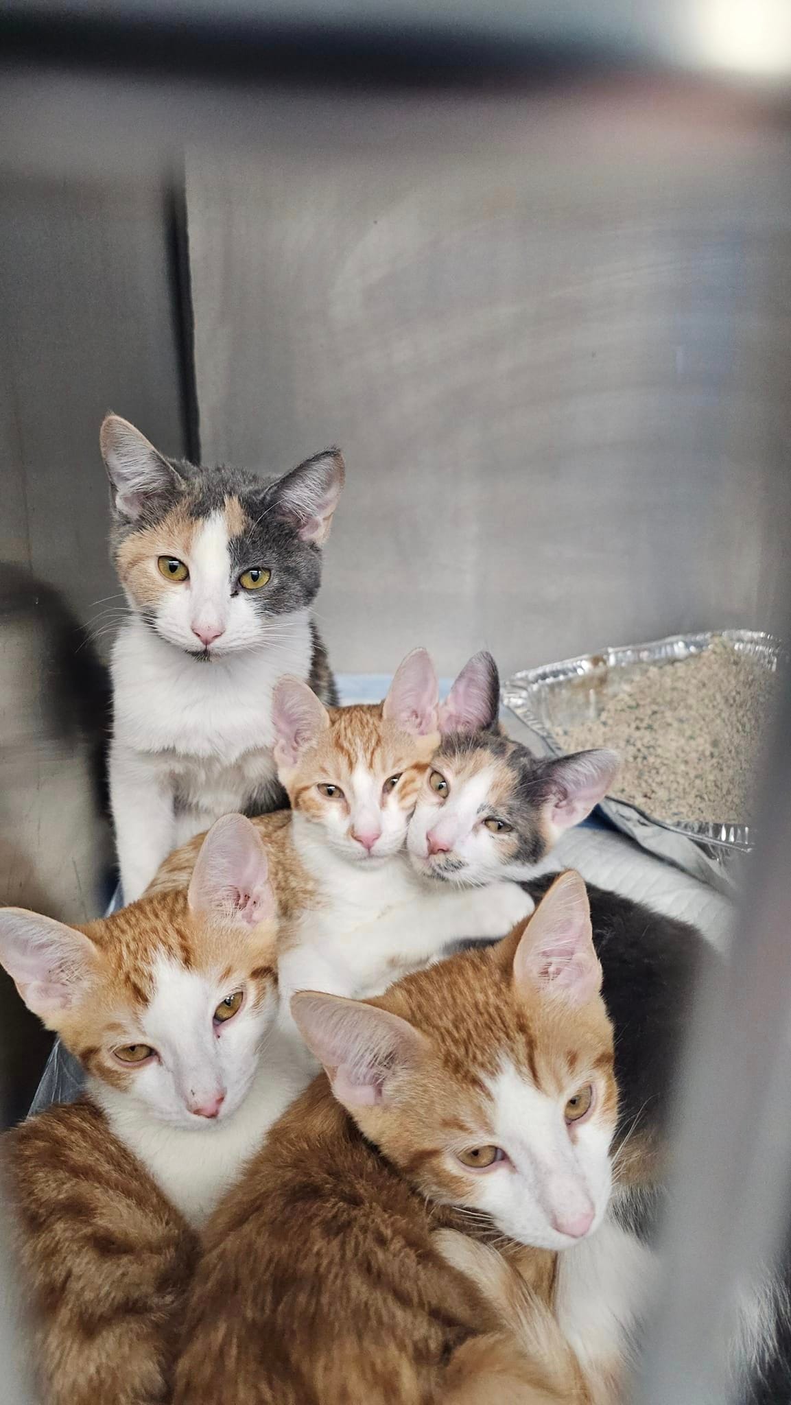Oh, yes, Sparky and the Gang takes in cats, too! This is a partial family photo of kittens and Momcat whom the Gang took from someone who was going to leave them in a box in the desert because he didn’t want them anymore (Stankewitz said that the temperature was 106 and they likely wouldn’t have survived). They did, thanks to Sparky and the Gang, and now, they’d like to live. They do well with dogs and love to play. Individual photos are on the rescue page.
