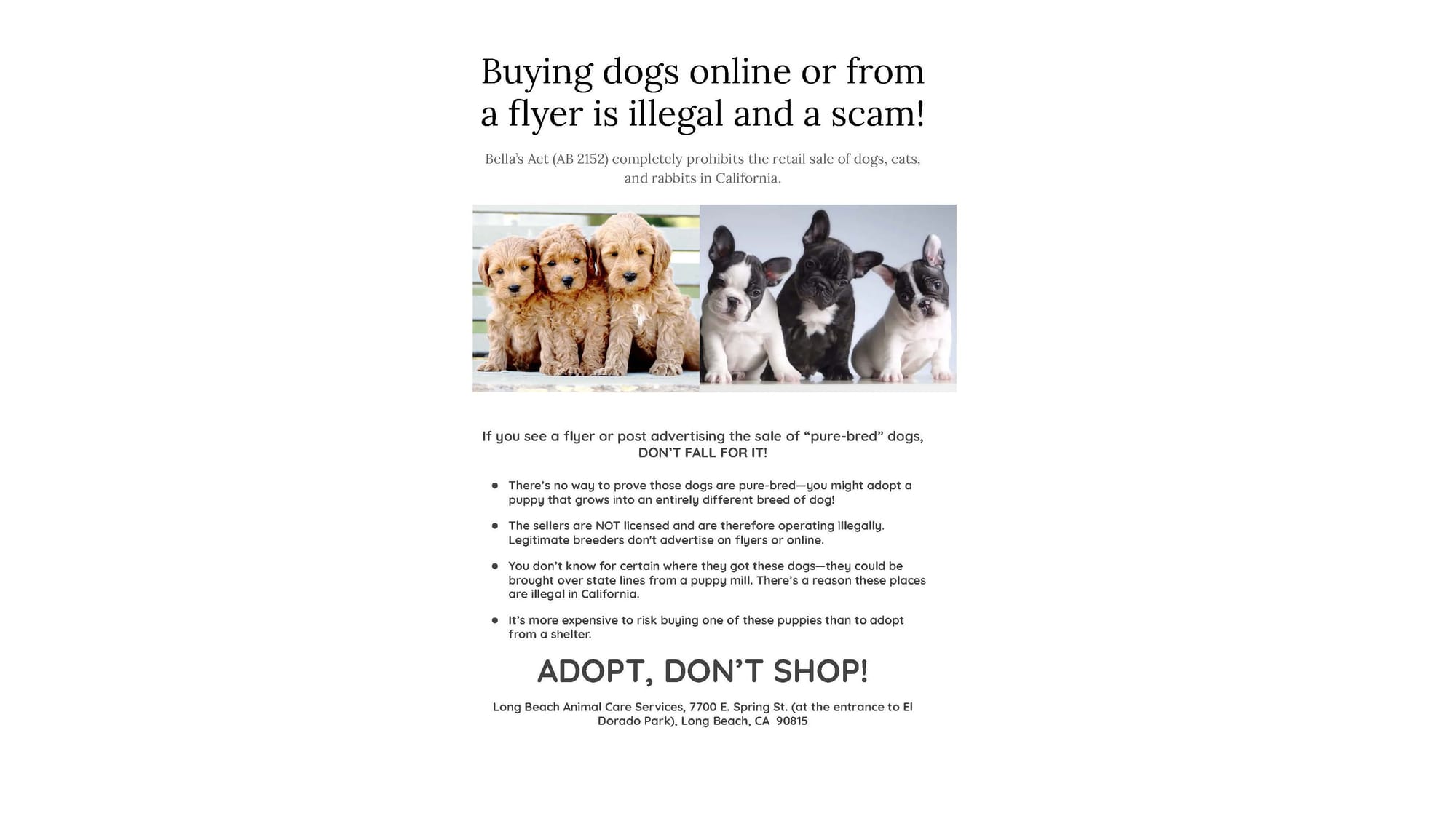 Last week’s Scratch This described the battle that shelters, rescues and animal-welfare activists continuously fight to get rid of mass puppy mills and prevent individual unlicensed breeders from selling possibly sick and genetically defective dogs to customers who think they’re getting purebreds (they’re not). Many of the dogs bought from these breeders suffer and die from birth defects resulting from overbreeding or from diseases like parvo, which is expensive to treat and can lead to the animal’s death if not treated.