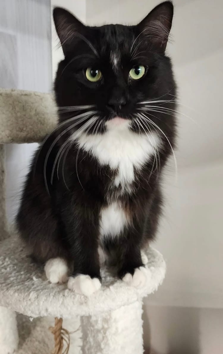 “Jellicle cats are white and black,” and this fluffy moppet is the jellycotypical Jellicle. His name is Tux, and he’s a little over a year old and the actual center of the universe. Give him a whisker’s length, and he’ll vociferously monopolize the conversation. Tux loves to be brushed, snuggle time on the sofa, and helping you work from home. In fact, he’s an excellent supervisor and is already dressed for the job. He can be, shall we say, mercurial and as such is going to be happiest as an only cat. He's neutered, microchipped, vaccinated and ready to go home.
