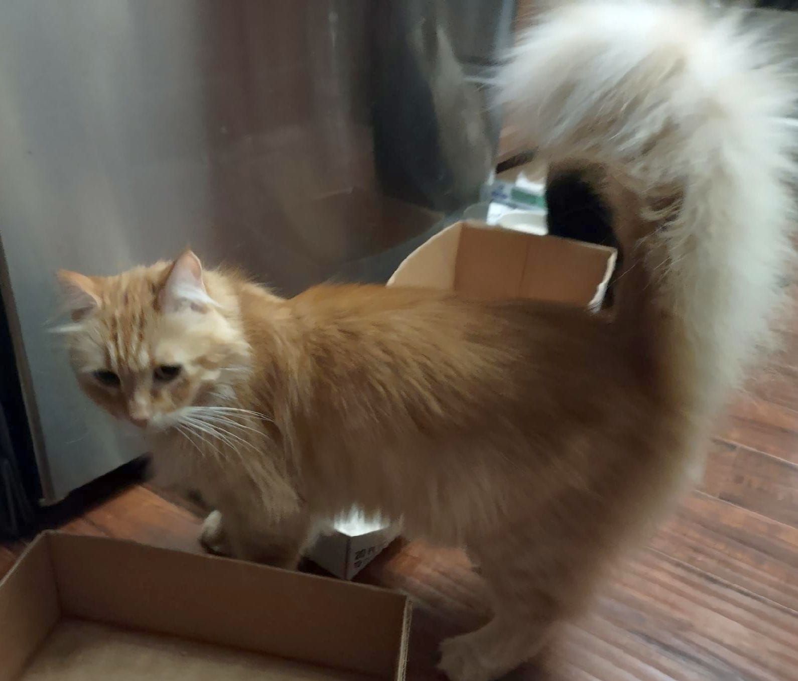 What a long, strange tail it’s been! Jerry Garcia loves to carry that tail high in the air. Everywhere he goes, he makes an entrance. Jerry is also super-sweet and, in defiance of his senior status, has the energy of a kitten and loves to play. He’s affectionate, too, and often will sleep next to his foster and beg for pets. Jerry’s a little skittish when new people visit and will run into another room. Once he’s determined the safety, he can be scared when new people come over and will run to another room until he's determined it's safe. Then, Jerry Garcia’ll come truckin’ out!