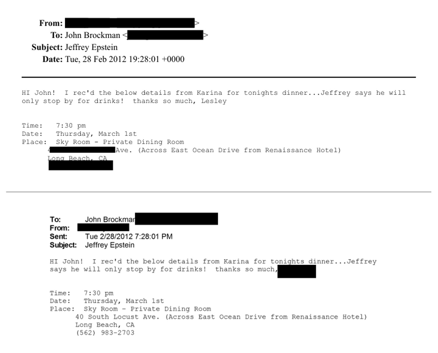 A Feb. 28 email from Lesley Groff to John Brockman regarding a dinner with Epstein and a woman named Karina in a private room at the Sky Room in the historic Breakers building. Groff said Epstein would only “stop by for drinks!”